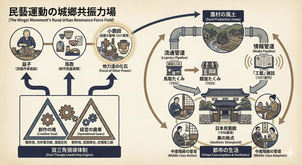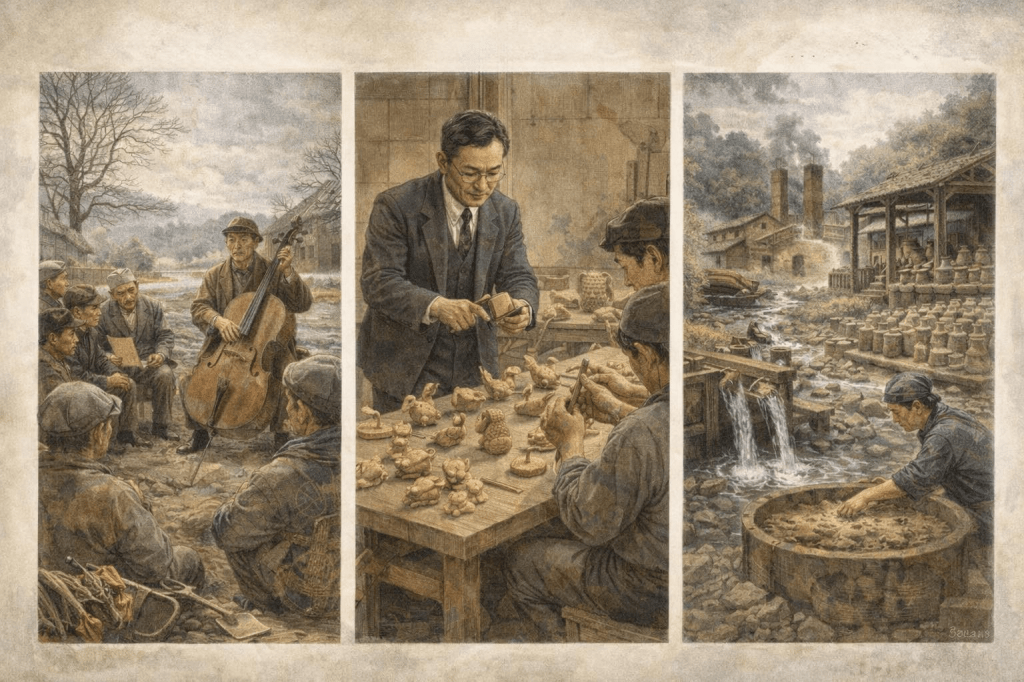 到了1920年代初期,民藝宣言登場之際,日本農業人口比例已進一步降至約50%左右,而製造業與相關工業部門的就業人口,則上升至總就業人口的20%以上。這意味著,日本已完成第一次意義上的工業化轉型,社會不再以農村為唯一基礎,而開始以都市與工業區作為吸納人口與資本的核心。在這樣的結構下,原本嵌入農村生活節奏的手工業,不再只是地方內部的技藝問題,而被迫面對來自工業生產體系的全面競爭。