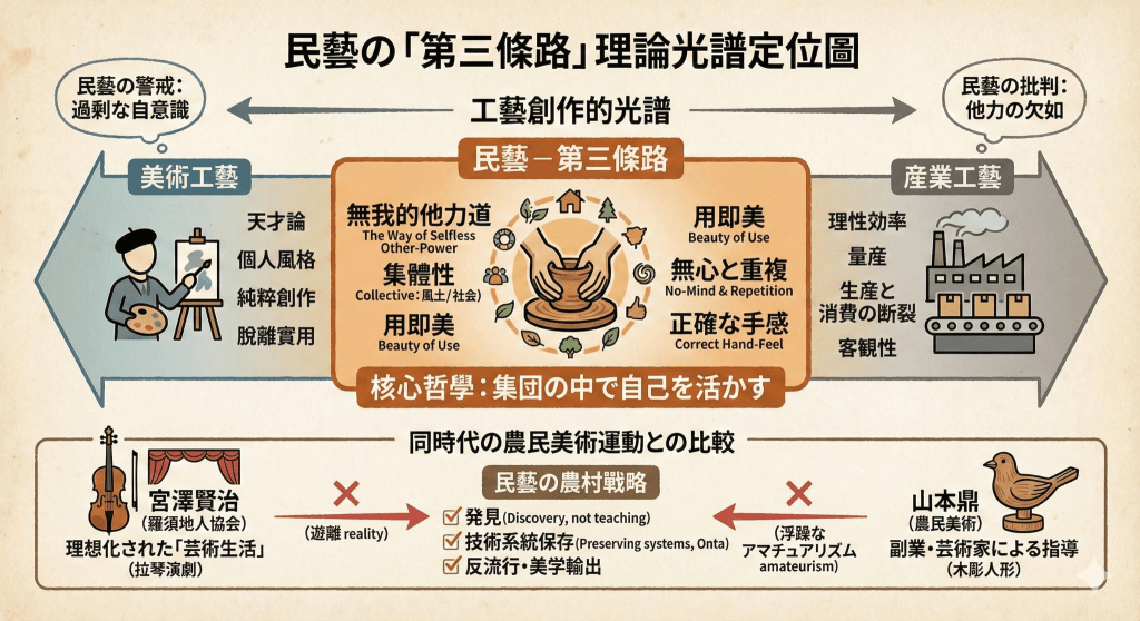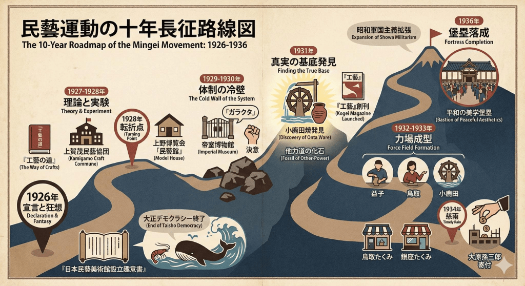 高野山西禪院的一夜,並不是在真空中誕生的激情時刻,而是發生在工藝體制即將凝固成「想當然爾」的秩序前夜。兩條主流路線在同⼀年確立了平⾏共容的「⼯藝體制」:一條通往官展與美術體制,追求「精美」;一條通往產業化與外銷經濟,追求「規格」,在同一歷史時刻完成制度定型。而柳宗悅與其覺醒的工藝作家朋友們心情急迫同時興奮,他們看見了這兩條路線之外,再不起身呼喚就將被錯過的可能性,一條隱約存在那裏從過去延伸到遙遠未來的「第三條路」(the Third Way)。