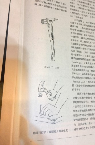 為了解開困惑,我前往職人工作的場所觀察,詢問他們怎樣握鎚工作,當然也蒐集閱讀與敲擊相關的資料,想瞭解一秒不到的鎚擊瞬間究竟發生了什麼事。然後我發覺錯了!榔頭的身世之謎隱藏著人類誕生的契機,甚至極端地說,教導了我們跟直覺相反的驚異故事:工具創造了人,而不是人創造了工具。