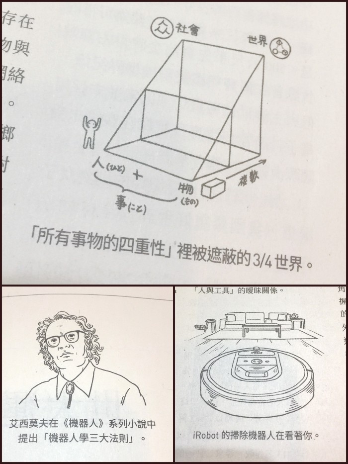 關鍵在這裡:單單只是「人」與「物」在杜威所謂的「經驗」中接合還不足以構成一件事物,「人-物」之外還藏著「單數-複數」這個跟它十字交叉的隱藏軸線。如果把兩者一起都放入視野,我們就有了同時存在於四個向限中的「所有事物」。物與人的事都一定要處在複數的關係網絡中,活動才能順暢無阻地持續存在。煙包等待打火機,板擦呼喊白板,榔頭渴望釘子,它們雖然對於親和的對象都有一定的寬容(衛生紙有時可以替代板擦,火柴棒也可以在沒打火機時拿來應急),但也絕不是隨便就跟任何對象搭訕,板擦與白板之間如果夾了「不合群」的油性筆就會壞了彼此的關係,太過大號的槌頭會讓敲擊時必要親密的手指與釘子陷入緊張。