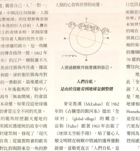 所有的製圖師都清楚,透過投影技法將全球化為平面,扭曲與侷促是必然的代價;但地球儀不同,在我們眼前的是完整立體的球體(whole earth)。地球儀勾引人類遐思的是既分裂又統合的知性興奮,想像從浩瀚宇宙中某個「接近神的位置」觀看自己,人「一對一」直面地球,中間沒任何障蔽。人類每個「完整地球」的狂想都像是張沖洗顯影未竟的巨大自拍,人疊在藍色星球上的表情未明,某個深邃的啟示正等待著人類的恍然大悟。
