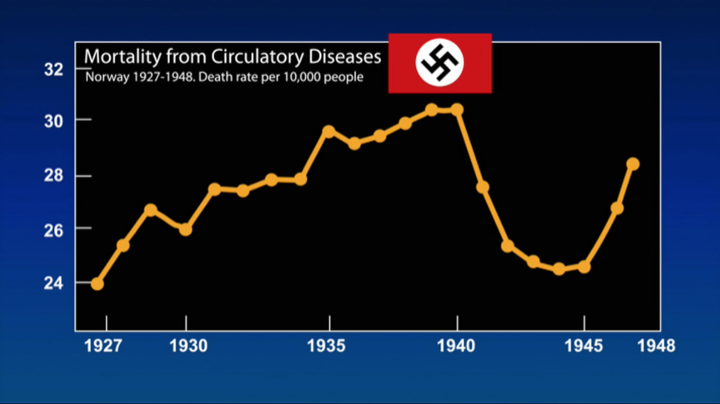 1970年早期,心臟病發的機率,美國也比中國農村多了十二倍。那些罹病機率低的地方,以肉與乳為重的西式飲食幾乎不存在。最戲劇性的發現是,二戰期間,挪威因為被德軍佔領,農場等肉品源頭為德軍所充公,國民不得已只好吃素,罹心血管疾病比例大幅降低,到了1945年德軍撤退後又開始逐年拉高,是的,跟自殺率一樣,萬分之幾的機率穩定逐年的變化。