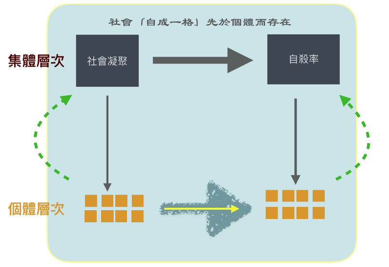 涂爾幹被認為是開創社會學「方法論集體主義」(methodological collectivism)的代表人物,如下圖所示強調從「集體的因」一致地解釋「集體的果」,統計機率提供他如心理學測量儀器般、但卻是在實驗室之外的開放社會中展演(perform)出「社會事實」客觀存在的工具,讓他可以將問題意識的因果檢視「頭尾一貫地」對焦在「群」的集體層次。但這樣乍看之下抽離的社會學分析,回答我稍早提出的質疑,跟我們對自殺的現實關懷有關嗎?
