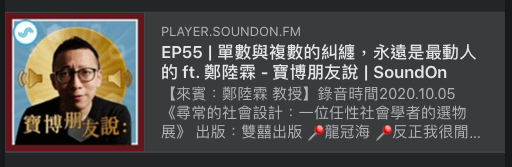 跟寶博瘋聊「單數與複數的動人糾纏」 發表於14 十月, 20201 一月, 2021 由lulincheng撰寫 錄PODCAST可以快樂到如此無法擋,這麼瘋狂的事我也沒想到過。《尋常的社會設計》,很不尋常的兩位宅男近身「博逗」,主持人笑到頻頻拭淚,是真的! EP55 寶博朋友說:單數與複數的糾纏,永遠是最動人的 分享此文: 按一下以分享至 Facebook(在新視窗中開啟) Facebook 按一下即可分享至 X(在新視窗中開啟) X 分享到 LinkedIn(在新視窗中開啟) LinkedIn 喜歡 正在載入... 相關
