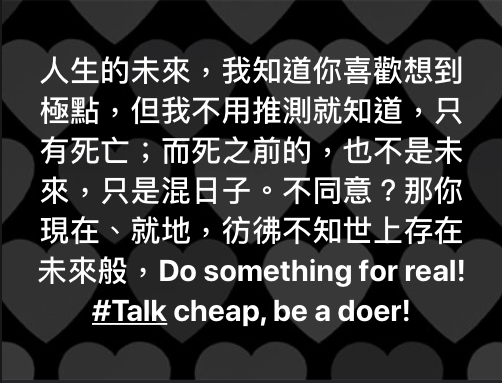 活在當下 發表於8 十二月, 20201 一月, 2021 由lulincheng撰寫 人生的未來,我知道你喜歡想到極點。 但我不用推測就知道,只有死亡;而死之前的,也不是未來,只是混日子。 不同意?那你現在、就地、彷彿不知世上存在未來般,Do something for real! #Talk cheap, be a Doer! 分享此文: 按一下以分享至 Facebook(在新視窗中開啟) Facebook 按一下即可分享至 X(在新視窗中開啟) X 分享到 LinkedIn(在新視窗中開啟) LinkedIn 喜歡 正在載入... 相關