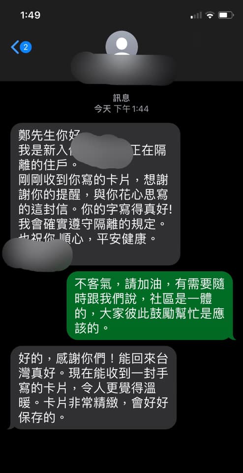 今天清晨快速跟里長溝通了解居家隔離管制流程後跟住戶溝通說明,接著寫了張卡片給隔離住戶問候加油。