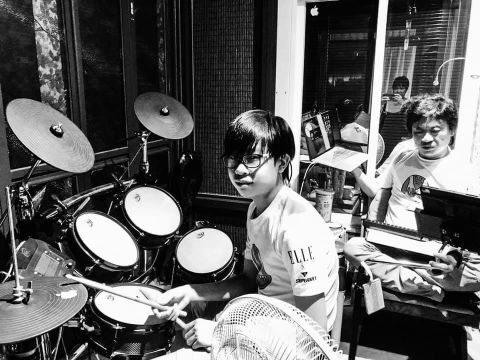 最近下多些雨涼快些,傍晚我就自然移動到最明亮的陽台區遊樂兼工作,今天晚餐後Kaya來了,小男孩打鼓自由發抒情緒的樣子很酷,這小子慢慢圓了老爹自己的夢想,我看在眼裡也與有榮焉過了乾癮。Febie「路過」拿出相機來紀錄我們,老爹盤腿坐在一旁像千手觀音,三個螢幕,三組鍵盤,可惜不是樂團的鍵盤手沒有辦法跟兒子搭配演奏,只會隨著思緒輕快地敲擊出一字一行的文章。