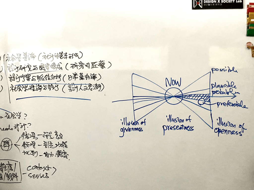 激烈腦力工作後昨夜睡得不好,整晚淺眠一直在繼續整理大量刺激啟發後對於設計的時間軸問題(雙錐體的過去-現在-未來時間軸)的思考整合,「足以啟發後續更多的演繹」這已經是她所提出探索架構具有設計研究價值的充分肯定,半夜竟然起來幾次摸黑在筆記本上書寫靈感,想當然爾早晨起床後整個人精神不振,跟著一整天頻頻打呵欠。