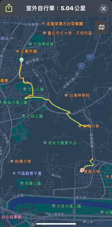 第三段最終會接到東吳大學至善路口,然後就是穿過寧靜的校園直接到後門錢穆故居旁的自強隧道口,再次避開大直與外雙溪交接的混亂交通。下次有空下班半途打算在東吳校園找個cafe小憩片刻,有夠假掰吧,哈哈。