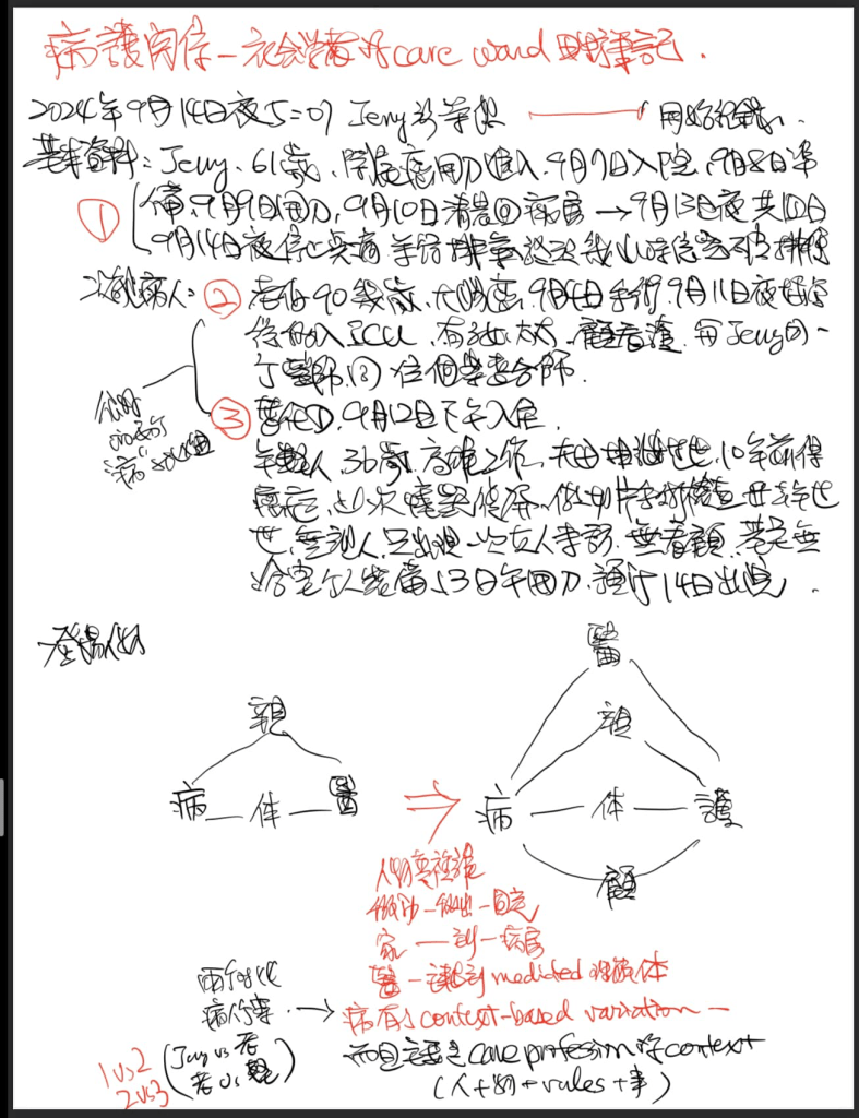 可惜無法錄音,手寫目前最順,趕緊塗鴉打底稿(研究開端的第一步,通常是這種來自生活的moments。)為了完整進行研究紀錄,是不是應該改單人病房?![]()
