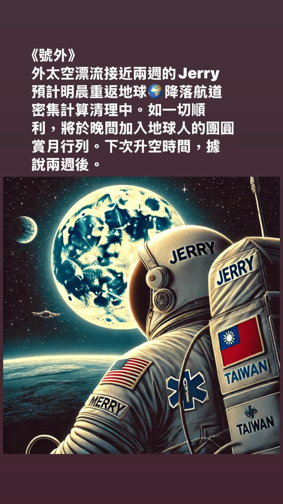 外太空人重返地球:明天出院! 發表於15 九月, 20247 十二月, 2024 由lulincheng撰寫 See U, on the Earth! 中秋節,月圓人一定要團圓! #終於要出院了!呼…. 分享此文: 按一下以分享至 Facebook(在新視窗中開啟) Facebook 按一下即可分享至 X(在新視窗中開啟) X 分享到 LinkedIn(在新視窗中開啟) LinkedIn 喜歡 正在載入... 相關