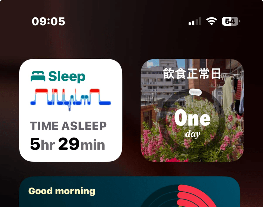 我的手機上是「恢復正常飲食」前的最後一天,終於完成!今天是我跟Febie一起看屋頂日出