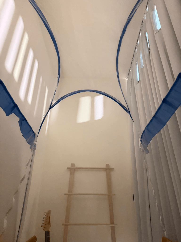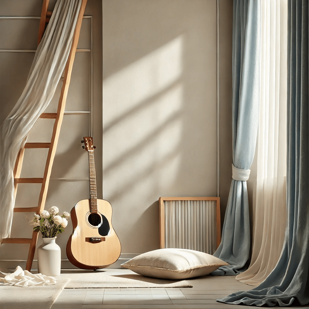 此刻眼前看到的景象,為了抗癌休息製作的布簾包裹著臥床的我,兒子上週才幫我鋪墊的蚊帳宛如屋的樑柱,牆上靜靜靠著許久未用的木衣架與舊吉他。