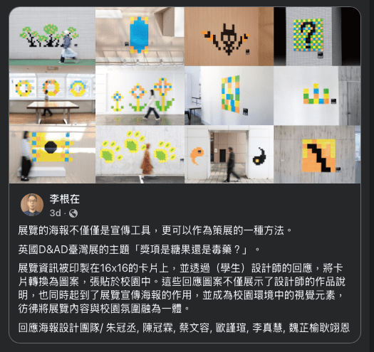 這個臺科大年輕設計師們的作品,在我看來暗示了「社會設計」可以展現,或「設計/藝術」可以混搭,甚至平面與空間,海報與策展,數位與實體…可以afford新的思考縫隙的一個可能。