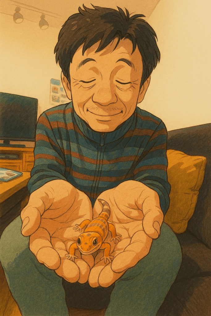 後來,我們自己養了兩隻守宮。第一隻豹紋守宮叫 Barco Bravo,好動又不怕生,每次靠近牠,都會主動探頭出來,甚至你靜坐旁邊看書,一轉頭她正低頭好奇你在讀什麼(人類總是想太多,哈哈);第二隻輪到肥尾守宮,我們叫她 Porco Rosso,因為 Febie 一開始在寵物店才剛見面就沒禮貌叫人家粉紅小豬,而我兒子剛好又是吉卜力的《紅豬》迷。