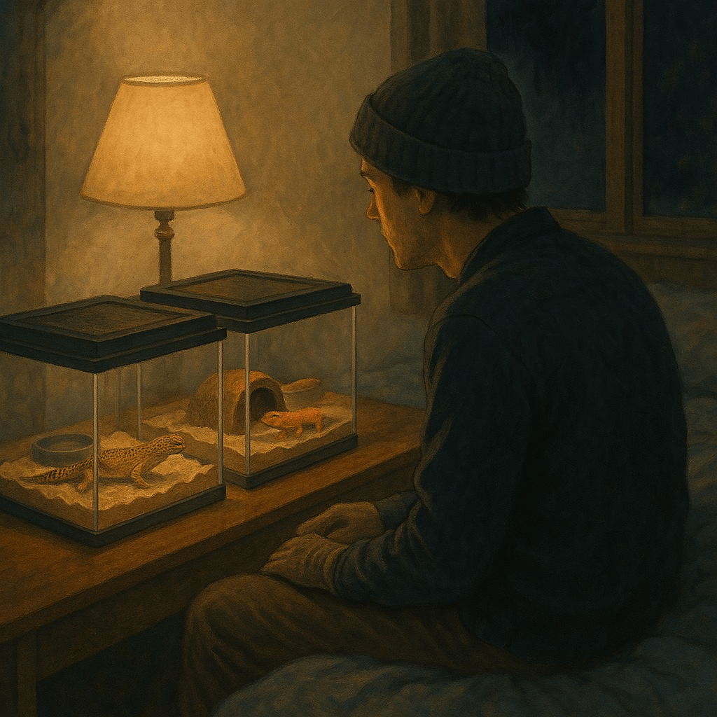 但低等的變溫爬蟲生物有趣嗎?會跟你互動嗎?比起狗貓,互動微弱得像是恍惚的葉影,就看主人心思是否纖細(別都怪「他者」,哈哈)。比起熱帶魚,喔,那可精彩呢。肥尾與豹紋,性格就差很多,但同樣是豹紋,寵物店裡一排下來,每一隻「個性」可都不同。