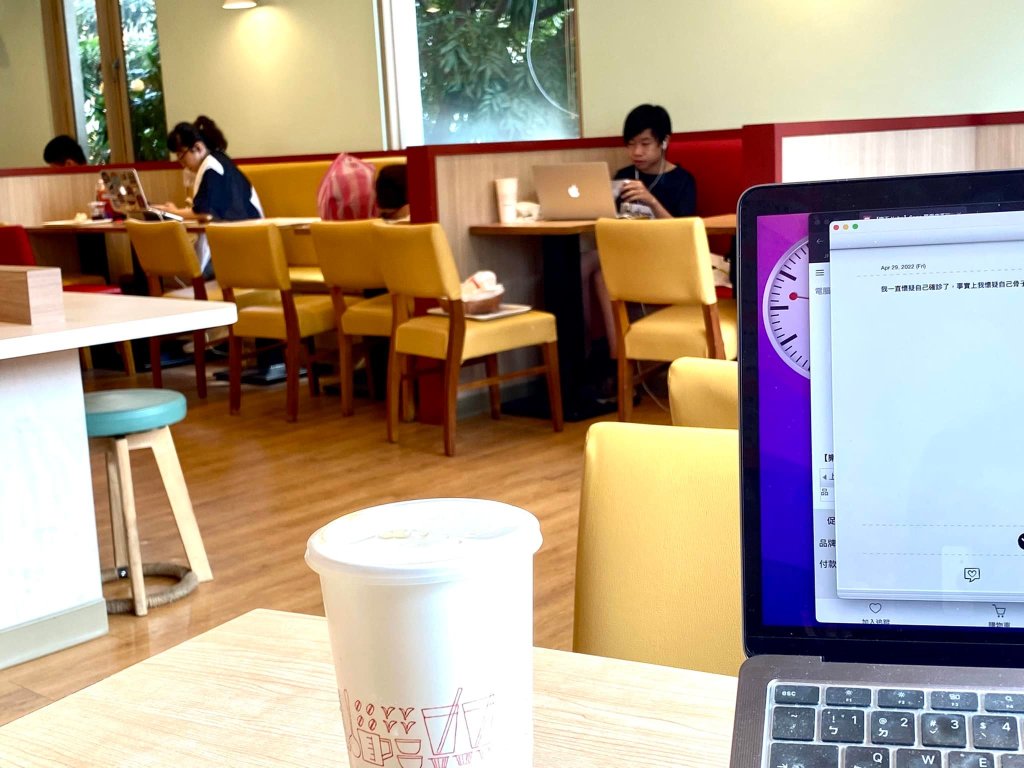 (圖)疫情大爆發,我跟兒子在依舊熱鬧的連鎖速食店裡安靜地各自閱讀工作。