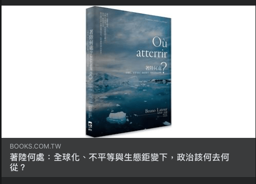 這本書剛上市,是根據法文版然後參酌了英文版的成果,翻譯者已經是翻譯拉圖的老鳥,這本通俗小書比起《面對蓋婭》讀來輕鬆許多,其實我的《尋常的社會設計》是受到此書英文版《Down to Earth: Politics in the New Climate Regime》的刺激才進入密集寫作階段的。所以,從群學收到這本書中文版的那一刻,我將它擺放在《尋常的社會設計》一旁看著,心中的感觸特別激動強烈。